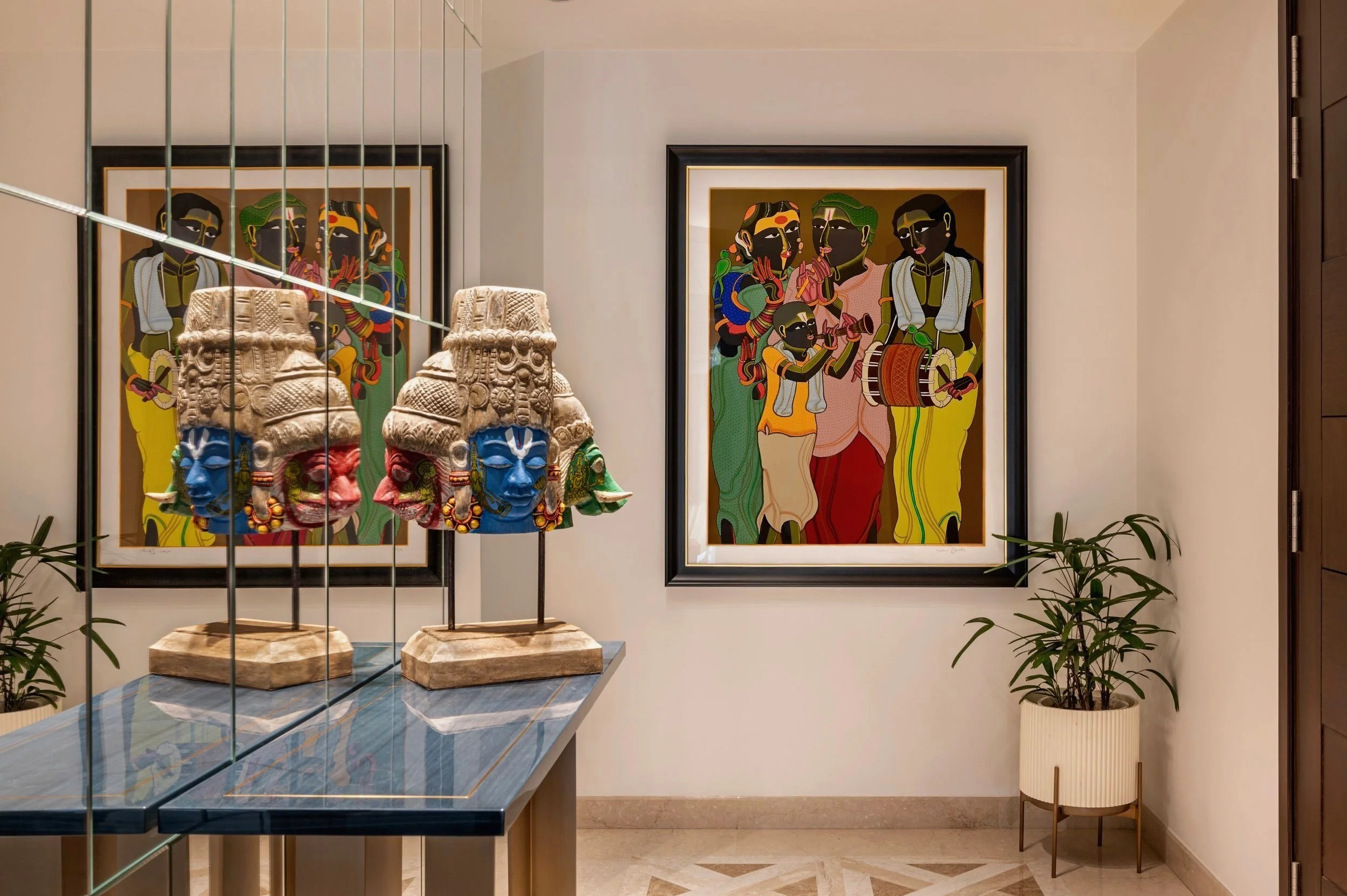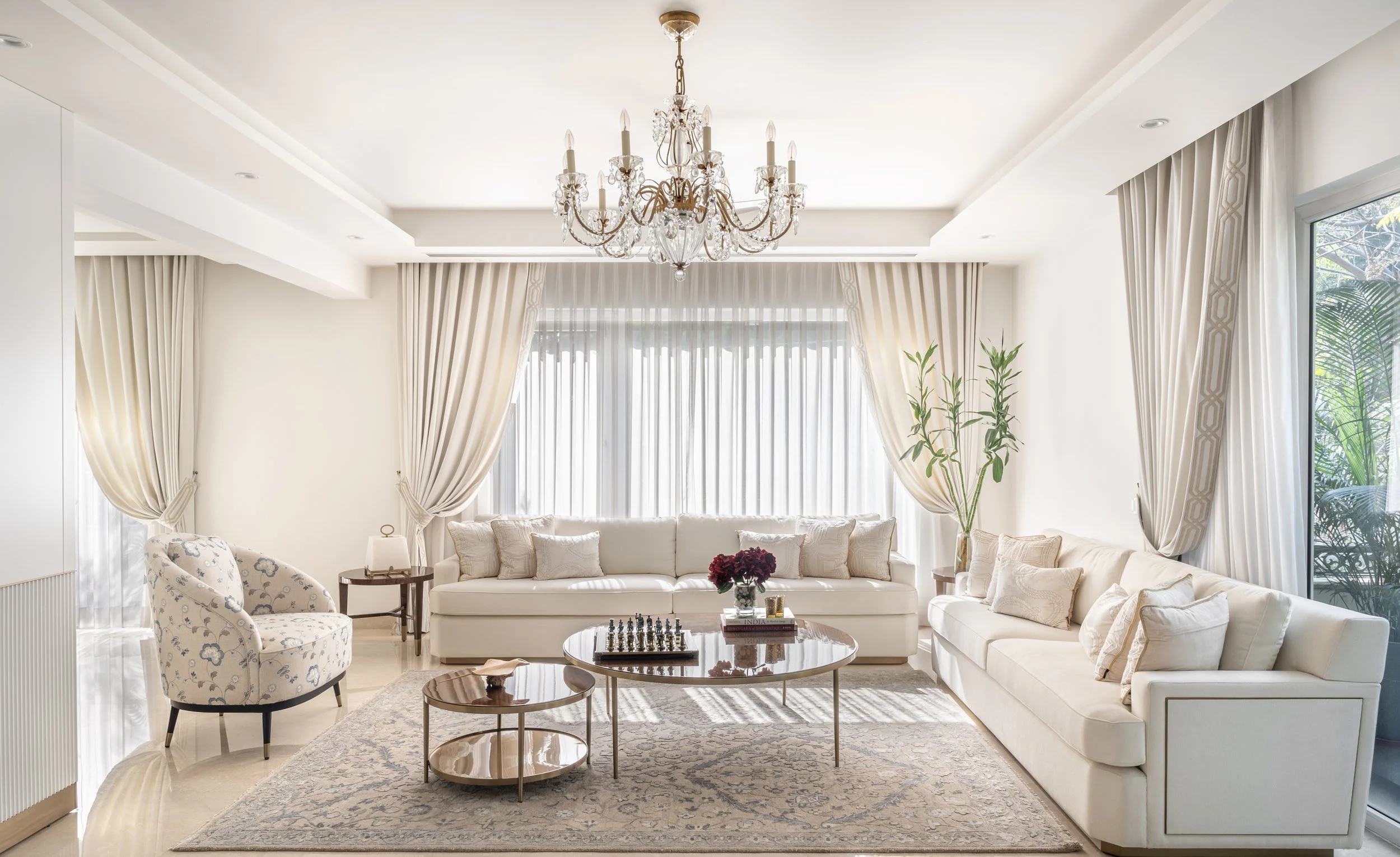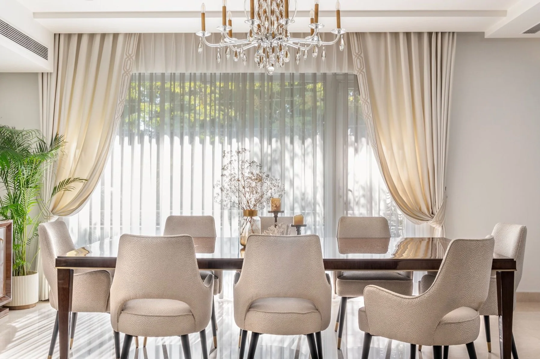 Utilitarian pieces like tech-integrated walk-in wardrobes, an island cocktail bar, and a family lounge blend functionality with glamour. Given the homeowners' background in technology and gadget industry, the home embodies a seamless synergy of timeless style and minimal design.